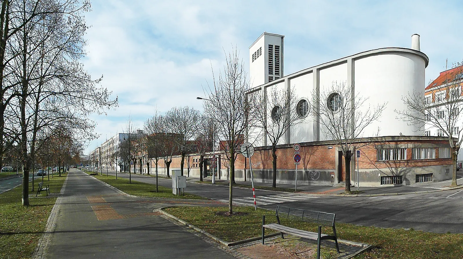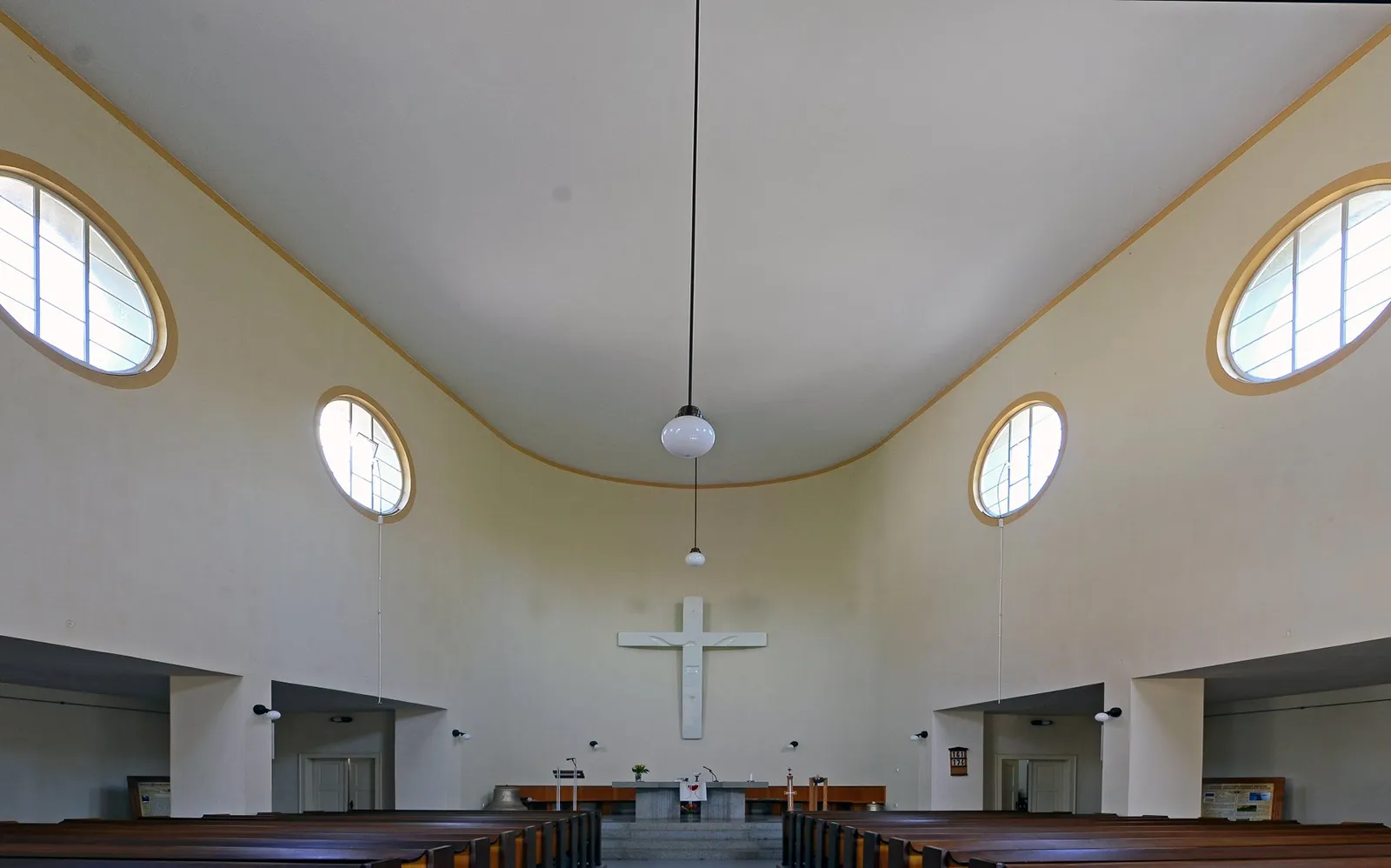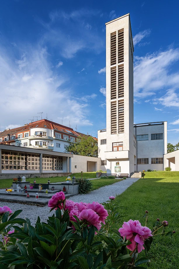 Josef Gočár pro kostel zvolil netradiční parcelu ostrého rovnoramenného trojúhelníku. Do ostrého úhlu parcely umístil objekt samotného kostela se zvonicí, do základny dvě kubické budovy – vedení diecéze a fary. Doprostřed trojúhelníku situoval obdobu zahloubeného rajského dvora s parkovou úpravou, kolem něhož rozprostřel krytý ochoz s kolumbáriem pro ukládání uren s popelem zemřelých. Chrámová část je zhotovena v bílém funkcionalismu s nautickými prvky, zbylé části jsou v režném zdivu. Ve vnitřních prostorách kostela je dbán důraz na jednoduchý a málo zdobený styl. Pozornost věřících se má upínat k velkému žulovému stolu Páně ve tvaru rozlomené hostie, jenž má současně symbolizovat otevřenou náruč. Nad stolem je připevněn velký bílý kříž ze sklolaminátu od výtvarníka Maxima Velčovského. Chrámová část je podložena železobetonovou konstrukcí. Železobeton byl využit i v rámu věže, která měří 28 metrů a je v ní umístěna zvonkohra. Celá stavba má podobu lodi.